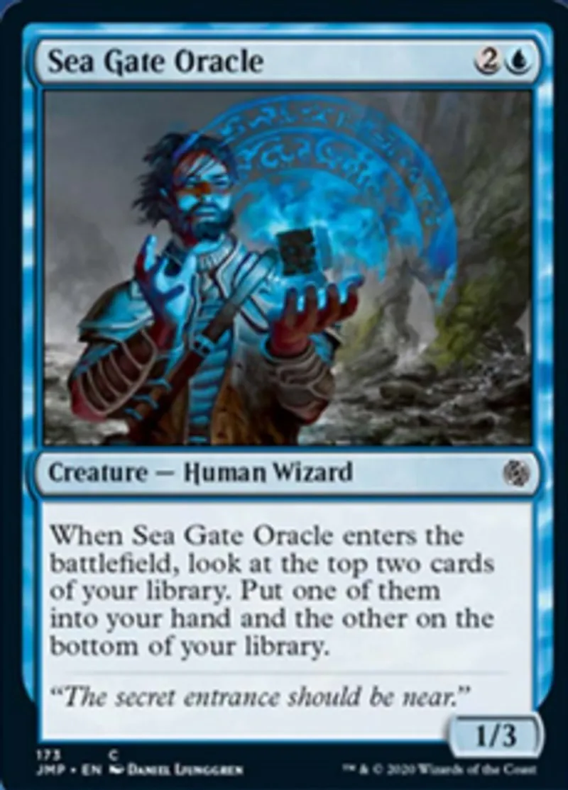 | Oracle Text | When Sea Gate Oracle enters the battlefield, look at the top two cards of your library. Put one of them into your hand and the other on the bottom of your library. | ||