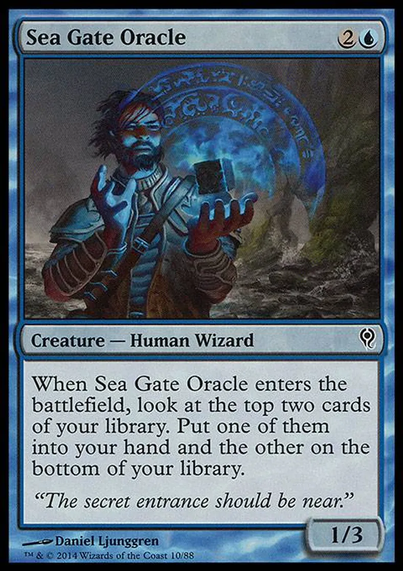 | Oracle Text | When Sea Gate Oracle enters the battlefield, look at the top two cards of your library. Put one of them into your hand and the other on the bottom of your library. | ||