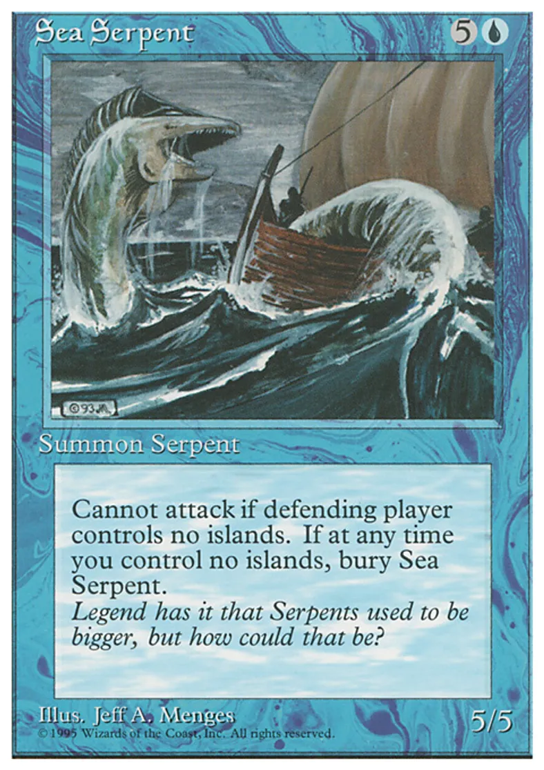| Oracle Text | Sea Serpent can't attack unless defending player controls an Island. When you control no Islands, sacrifice Sea Serpent. | ||