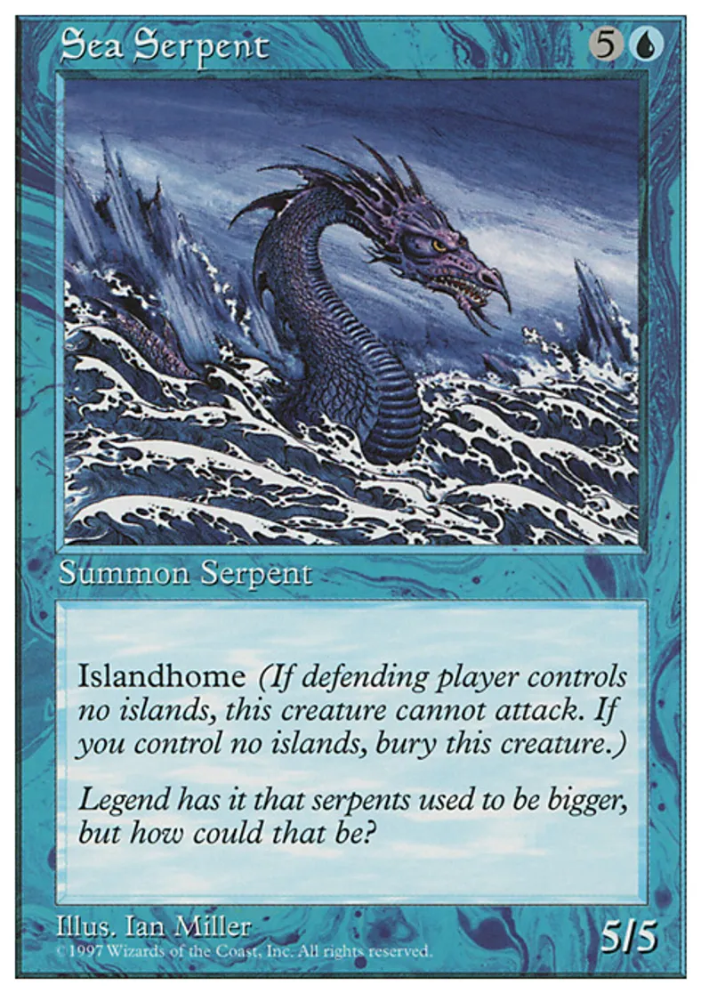| Oracle Text | Sea Serpent can't attack unless defending player controls an Island. When you control no Islands, sacrifice Sea Serpent. | ||