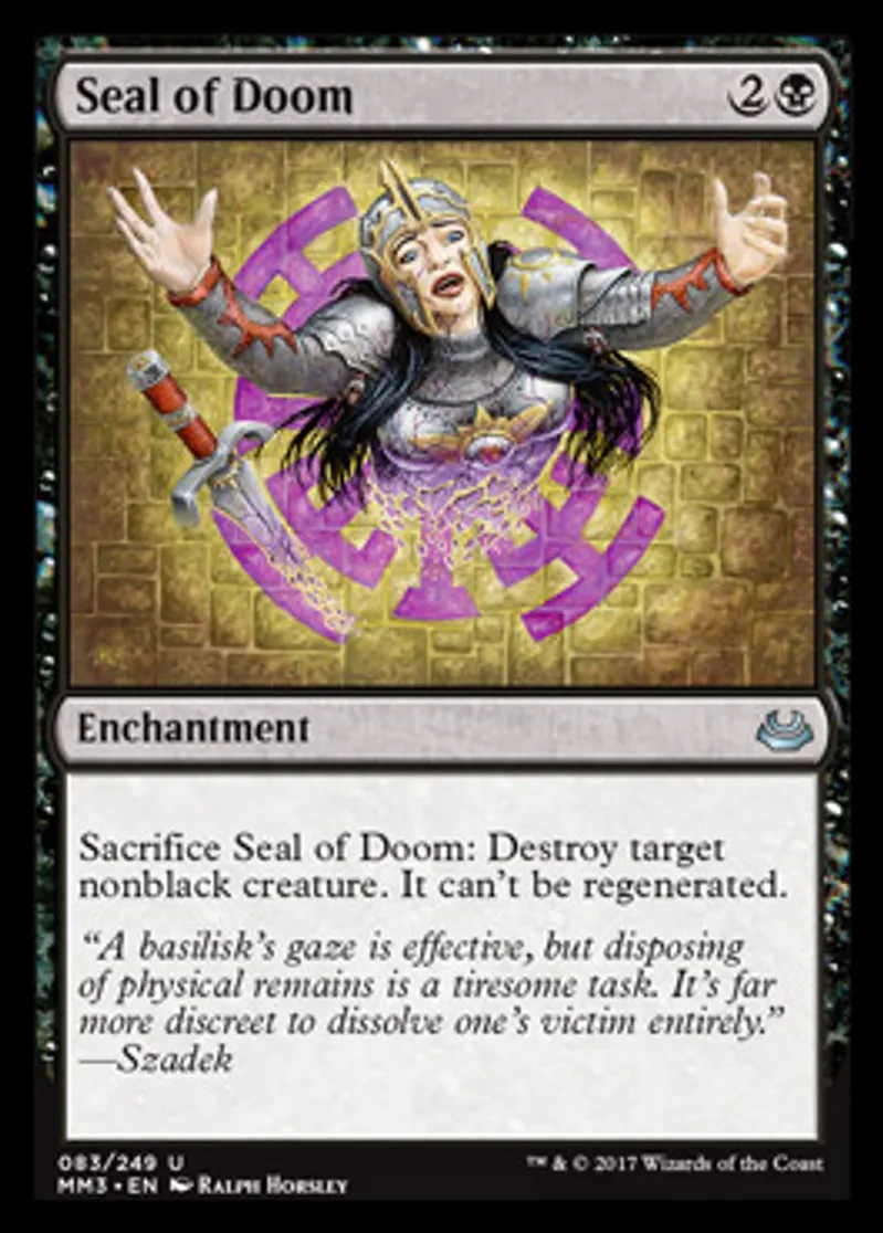| Oracle Text | Sacrifice Seal of Doom: Destroy target nonblack creature. It can't be regenerated. | ||