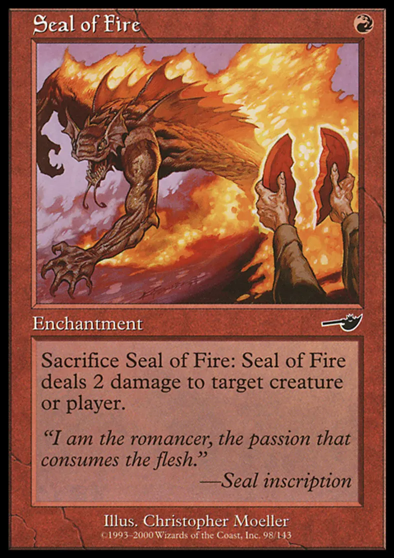 | Oracle Text | Sacrifice Seal of Fire: Seal of Fire deals 2 damage to target creature or player. | ||