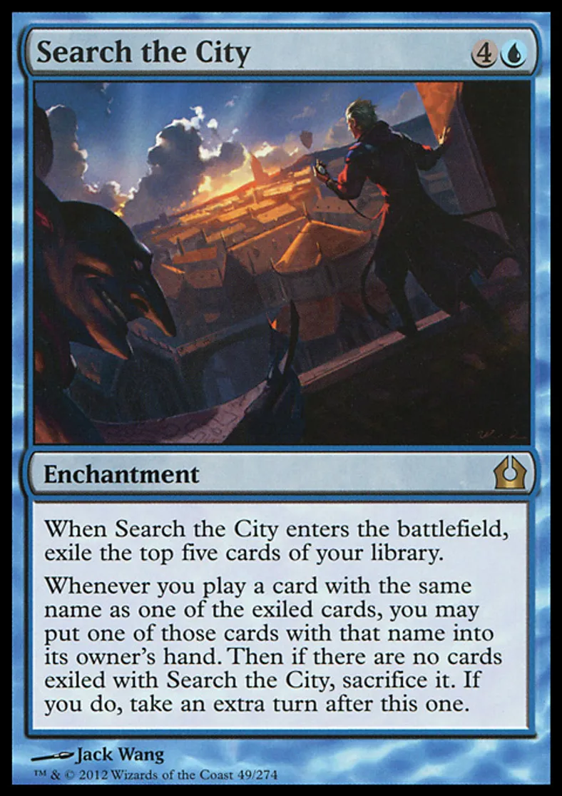 | Oracle Text | When Search the City enters the battlefield, exile the top five cards of your library. Whenever you play a card with the same name as one of the exiled cards, you may put one of those cards with that name into its owner's hand. Then if there are no cards exiled with Search the City, sacrifice it. If you do, take an extra turn after this one. | ||