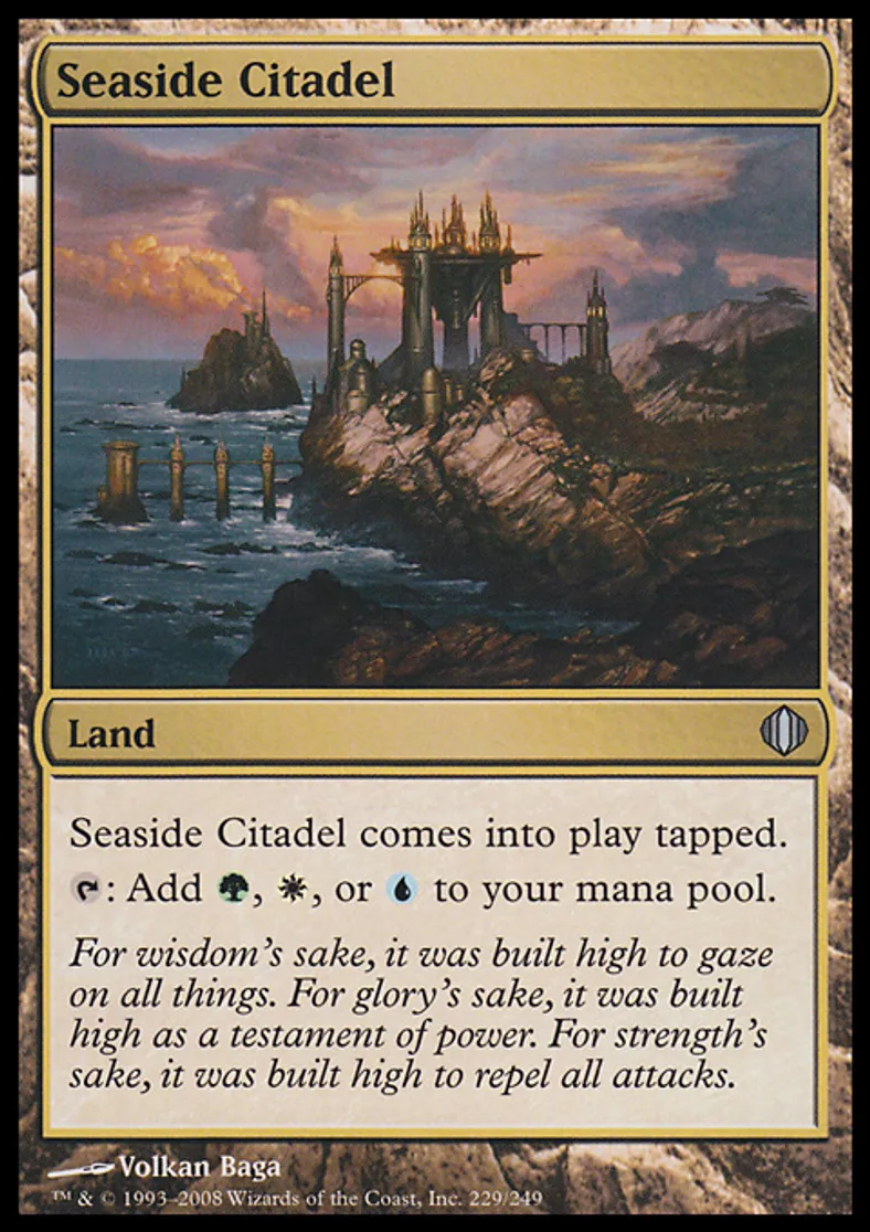| Oracle Text | Seaside Citadel enters the battlefield tapped. {{t}}: Add {{g}}, {{w}}, or {{u}} to your mana pool. | ||