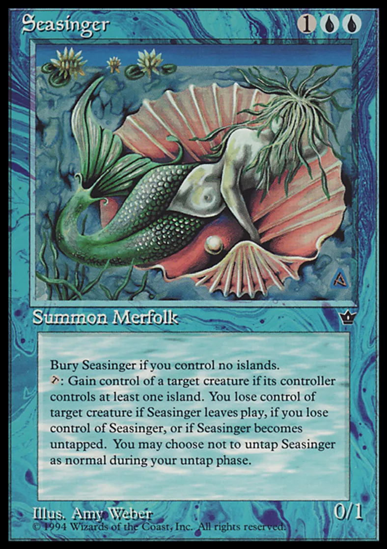 | Oracle Text | When you control no Islands, sacrifice Seasinger. You may choose not to untap Seasinger during your untap step. {{t}}: Gain control of target creature whose controller controls an Island for as long as you control Seasinger and Seasinger remains tapped. | ||