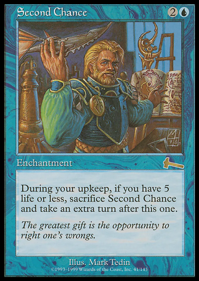 | Oracle Text | At the beginning of your upkeep, if you have 5 or less life, sacrifice Second Chance and take an extra turn after this one. | ||