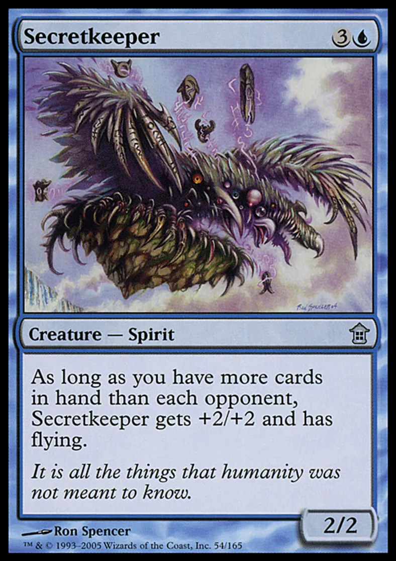 | Oracle Text | As long as you have more cards in hand than each opponent, Secretkeeper gets +2/+2 and has flying. | ||