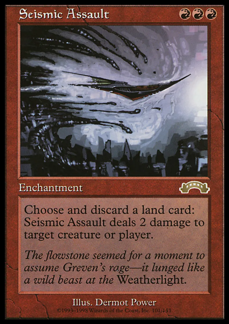 | Oracle Text | Discard a land card: Seismic Assault deals 2 damage to target creature or player. | ||