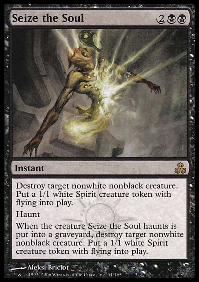 | Oracle Text | Destroy target nonwhite, nonblack creature. Put a 1/1 white Spirit creature token with flying onto the battlefield. Haunt (When this spell card is put into a graveyard after resolving, exile it haunting target creature.) When the creature Seize the Soul haunts dies, destroy target nonwhite, nonblack creature. Put a 1/1 white Spirit creature token with flying onto the battlefield. | ||