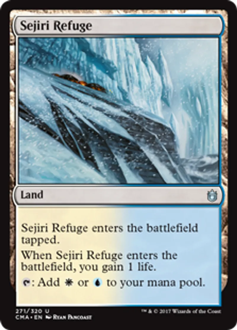 | Oracle Text | Sejiri Refuge enters the battlefield tapped. When Sejiri Refuge enters the battlefield, you gain 1 life. {{t}}: Add {{w}} or {{u}} to your mana pool. | ||