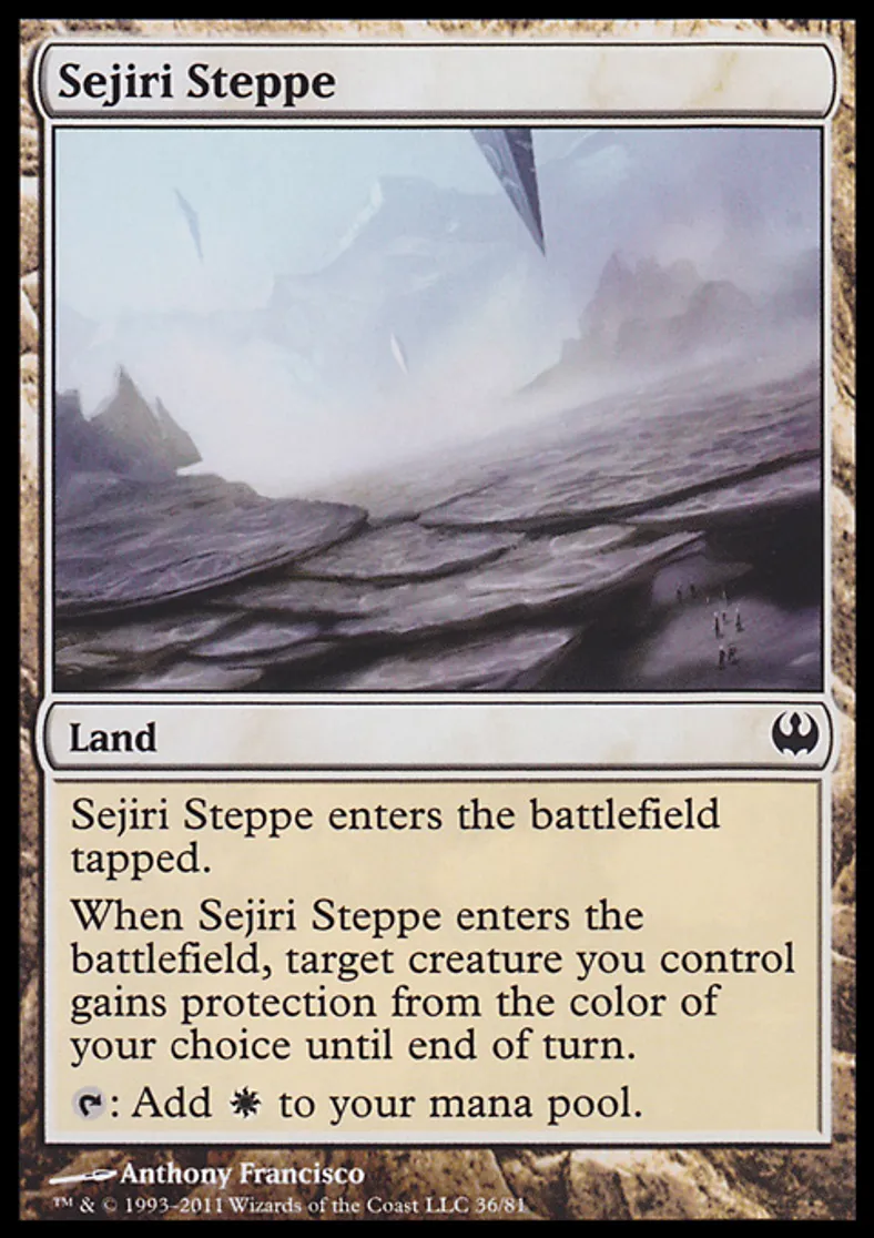 | Oracle Text | Sejiri Steppe enters the battlefield tapped. When Sejiri Steppe enters the battlefield, target creature you control gains protection from the color of your choice until end of turn. {{t}}: Add {{w}} to your mana pool. | ||