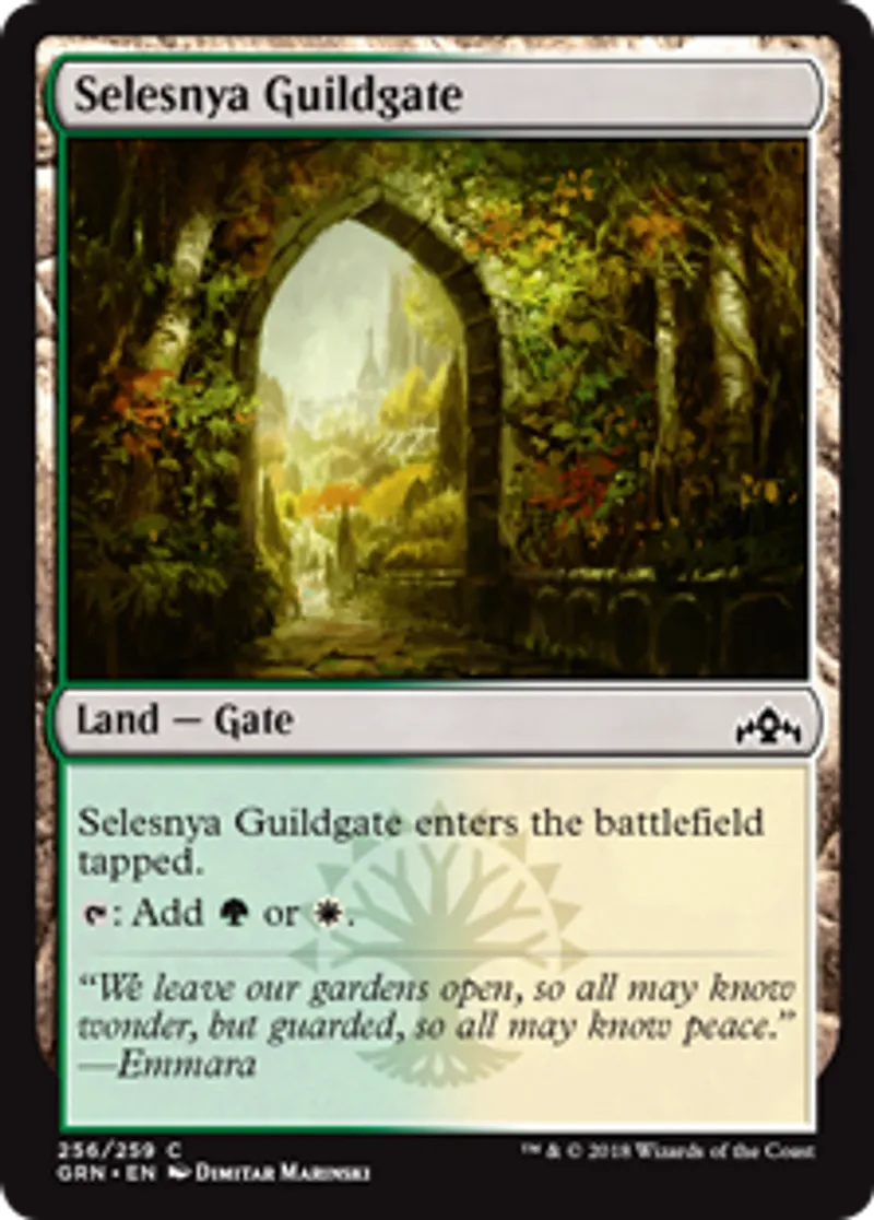 | Oracle Text | Selesnya Guildgate enters the battlefield tapped. {{t}}: Add {{g}} or {{w}}. | ||