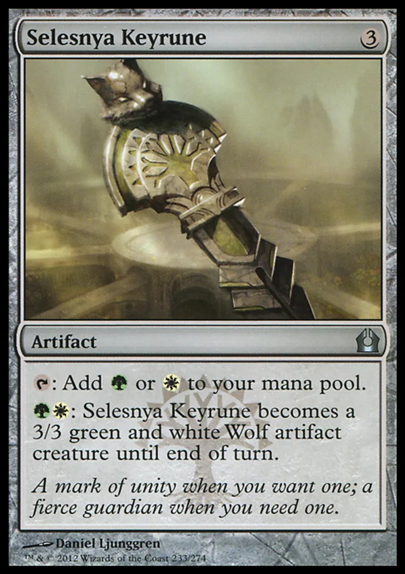 | Oracle Text | {{t}}: Add {{g}} or {{w}} to your mana pool. {{g}}{{w}}: Selesnya Keyrune becomes a 3/3 green and white Wolf artifact creature until end of turn. | ||
