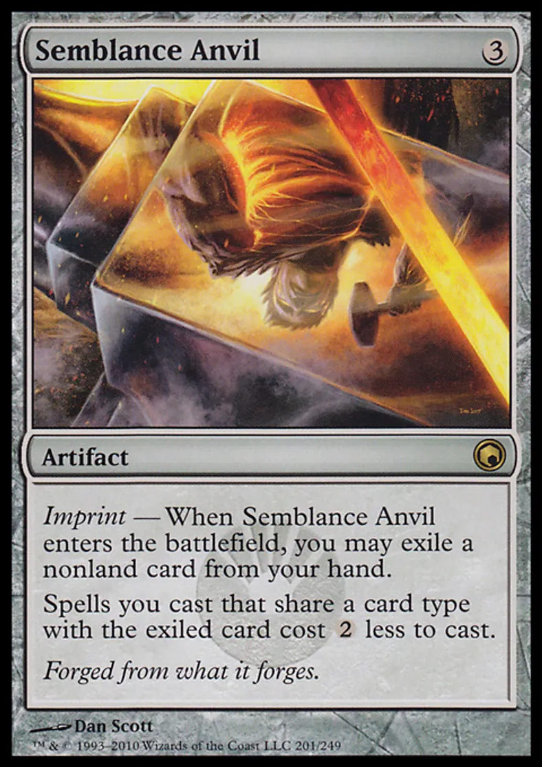 | Oracle Text | Imprint — When Semblance Anvil enters the battlefield, you may exile a nonland card from your hand. Spells you cast that share a card type with the exiled card cost {{2}} less to cast. | ||