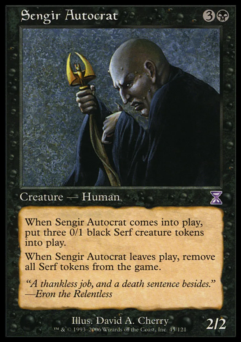 | Oracle Text | When Sengir Autocrat enters the battlefield, put three 0/1 black Serf creature tokens onto the battlefield. When Sengir Autocrat leaves the battlefield, exile all Serf tokens. | ||