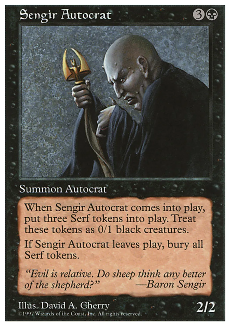 | Oracle Text | When Sengir Autocrat enters the battlefield, put three 0/1 black Serf creature tokens onto the battlefield. When Sengir Autocrat leaves the battlefield, exile all Serf tokens. | ||