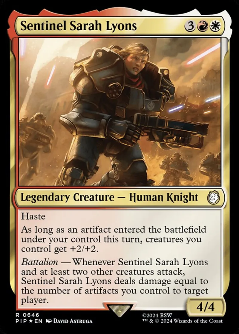 Magic: the Gathering (mtg) rare Legendary Creature — Human Knight Sentinel Sarah Lyons from Universes Beyond: Fallout (pip) last updated 2025-12-13 15:57:31