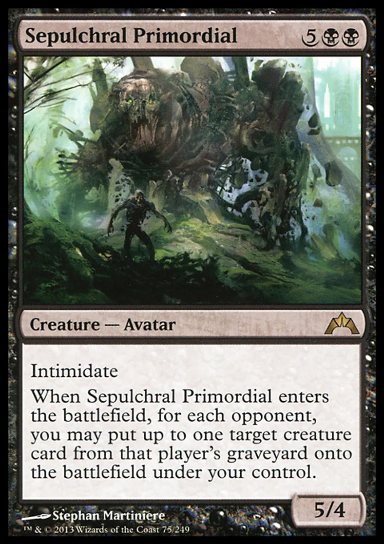 | Oracle Text | Intimidate When Sepulchral Primordial enters the battlefield, for each opponent, you may put up to one target creature card from that player's graveyard onto the battlefield under your control. | ||