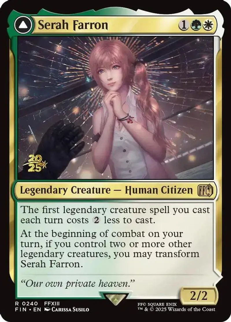at the beginning of combat on your turn, if you control two or more other legendary creatures, you may transform serah farron. // crystallized serah the first legendary creature spell you cast each turn costs 2 less to cast. legendary creatures you control get +2/+2. | ||