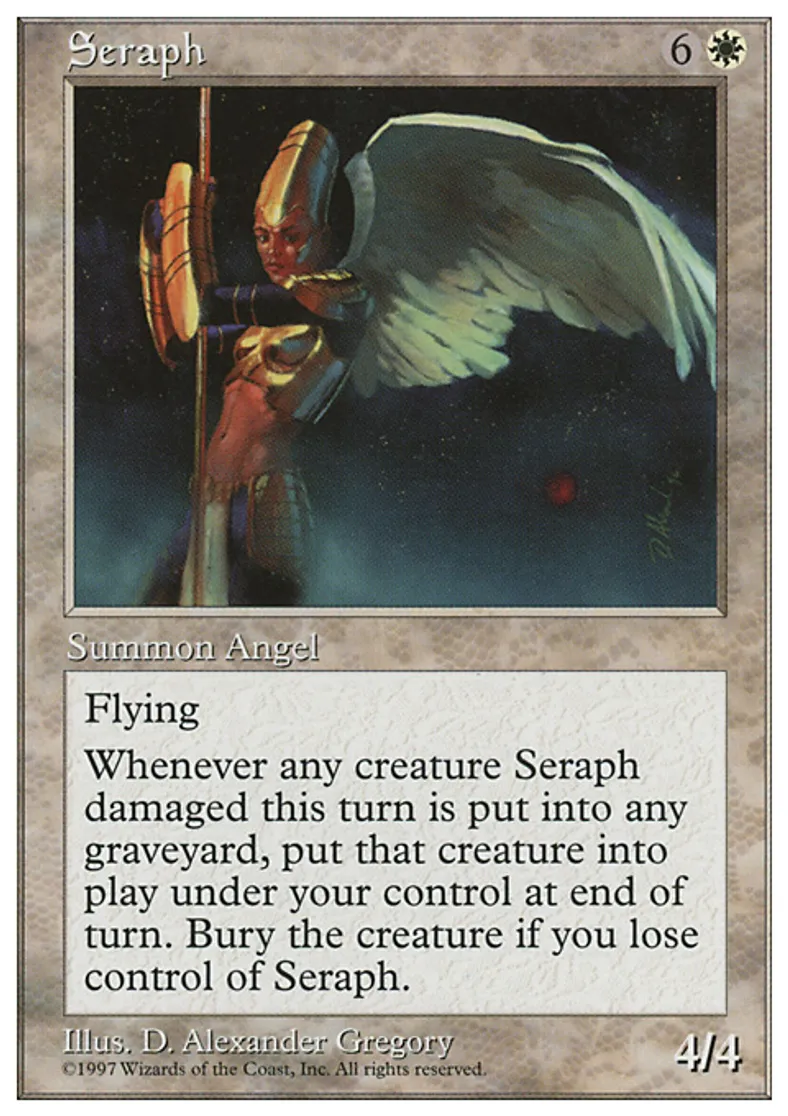 | Oracle Text | Flying Whenever a creature dealt damage by Seraph this turn dies, put that card onto the battlefield under your control at the beginning of the next end step. Sacrifice the creature when you lose control of Seraph. | ||
