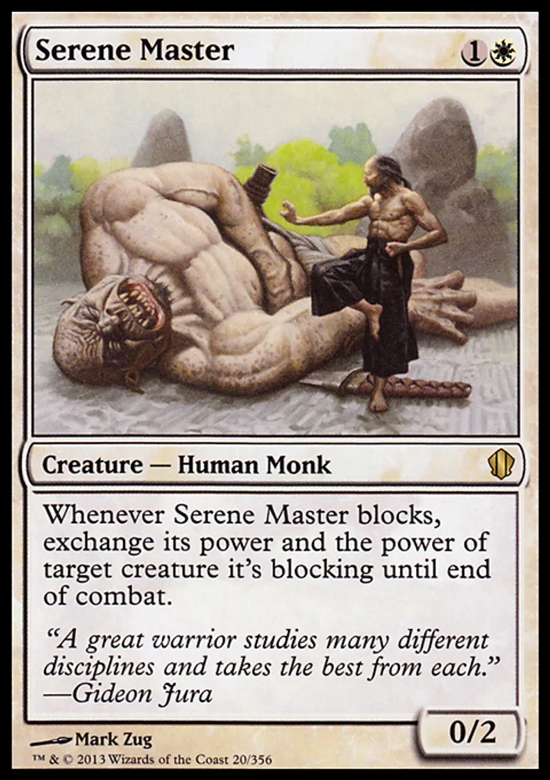 | Oracle Text | Whenever Serene Master blocks, exchange its power and the power of target creature it's blocking until end of combat. | ||