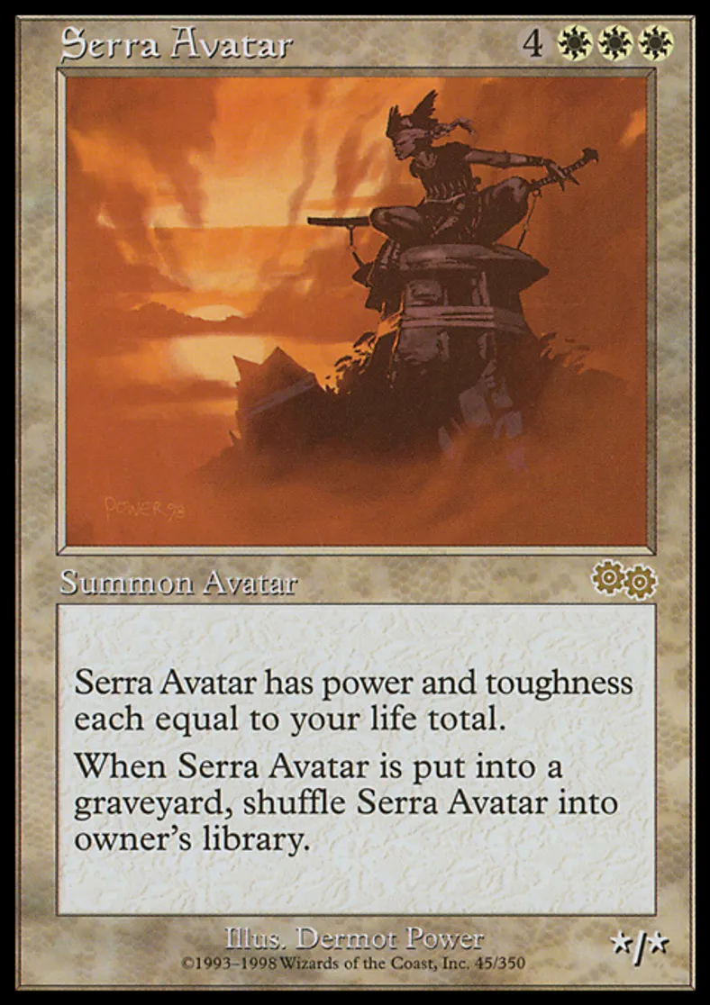 | Oracle Text | Serra Avatar's power and toughness are each equal to your life total. When Serra Avatar is put into a graveyard from anywhere, shuffle it into its owner's library. | ||