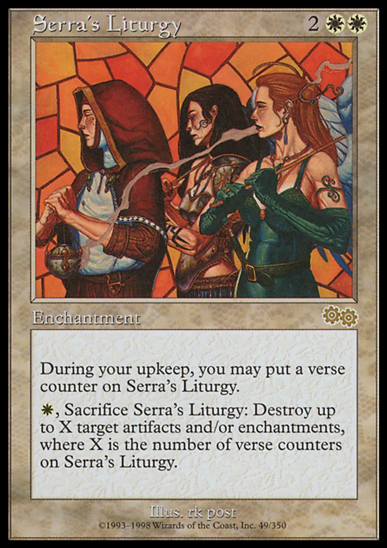 | Oracle Text | At the beginning of your upkeep, you may put a verse counter on Serra's Liturgy. {{w}}, Sacrifice Serra's Liturgy: Destroy up to X target artifacts and/or enchantments, where X is the number of verse counters on Serra's Liturgy. | ||