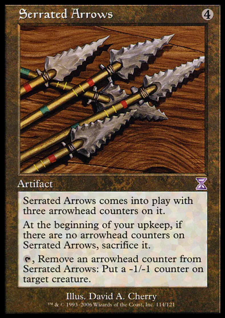 | Oracle Text | Serrated Arrows enters the battlefield with three arrowhead counters on it. At the beginning of your upkeep, if there are no arrowhead counters on Serrated Arrows, sacrifice it. {{t}}, Remove an arrowhead counter from Serrated Arrows: Put a -1/-1 counter on target creature. | ||