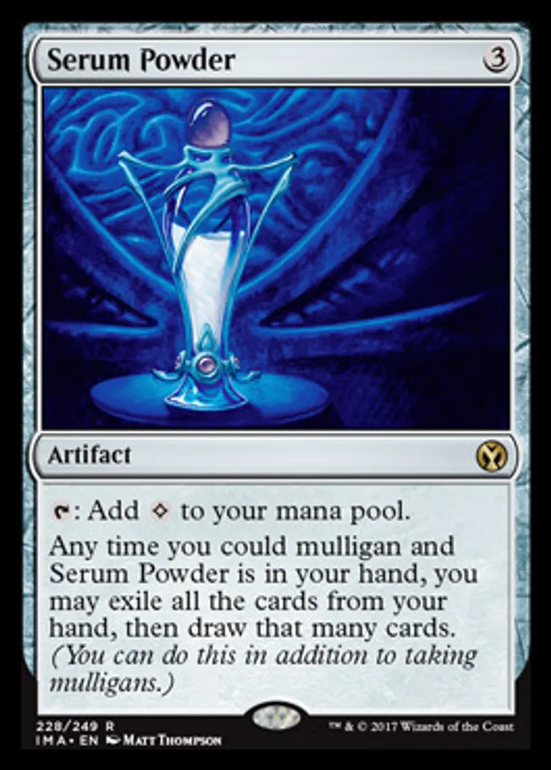 | Oracle Text | {{t}}: Add {{Colorless}} to your mana pool. Any time you could mulligan and Serum Powder is in your hand, you may exile all the cards from your hand, then draw that many cards. (You can do this in addition to taking mulligans.) | ||