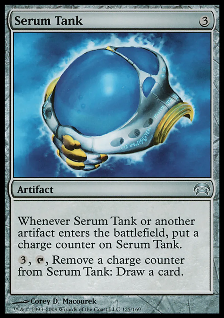 | Oracle Text | Whenever Serum Tank or another artifact enters the battlefield, put a charge counter on Serum Tank. {{3}}, {{t}}, Remove a charge counter from Serum Tank: Draw a card. | ||