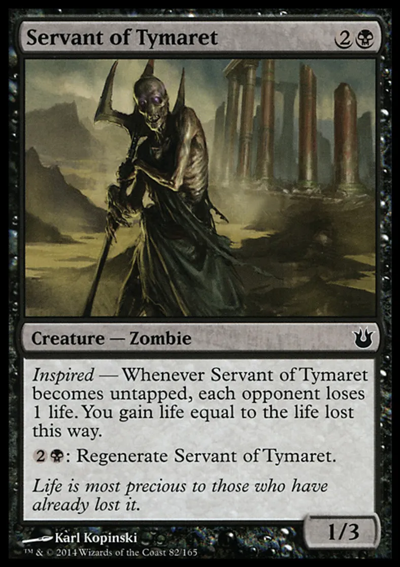 | Oracle Text | Inspired — Whenever Servant of Tymaret becomes untapped, each opponent loses 1 life. You gain life equal to the life lost this way. {{2}}{{b}}: Regenerate Servant of Tymaret. | ||