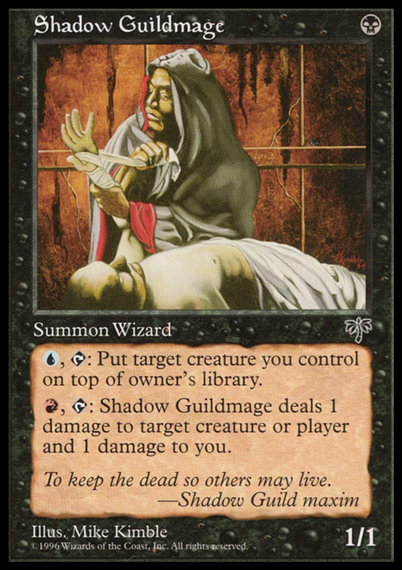 | Oracle Text | {{u}}, {{t}}: Put target creature you control on top of its owner's library. {{r}}, {{t}}: Shadow Guildmage deals 1 damage to target creature or player and 1 damage to you. | ||