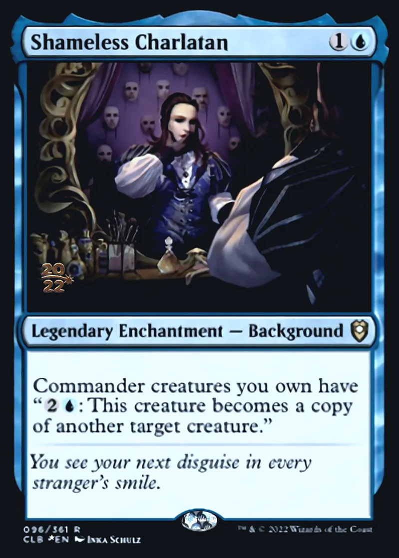 Magic: the Gathering (mtg) Rare Legendary Enchantment — Background Shameless Charlatan from Prerelease Cards (pPRE) last updated 2026-02-21 16:10:06