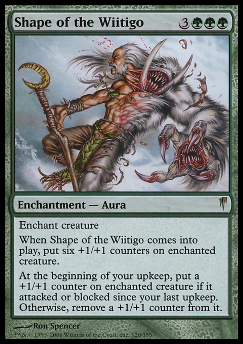 | Oracle Text | Enchant creature When Shape of the Wiitigo enters the battlefield, put six +1/+1 counters on enchanted creature. At the beginning of your upkeep, put a +1/+1 counter on enchanted creature if it attacked or blocked since your last upkeep. Otherwise, remove a +1/+1 counter from it. | ||