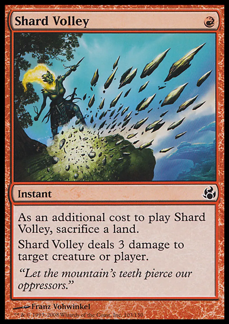 | Oracle Text | As an additional cost to cast Shard Volley, sacrifice a land. Shard Volley deals 3 damage to target creature or player. | ||
