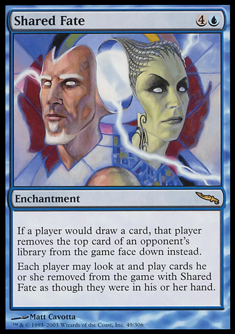| Oracle Text | If a player would draw a card, that player exiles the top card of an opponent's library face down instead. Each player may look at and play cards he or she exiled with Shared Fate. | ||