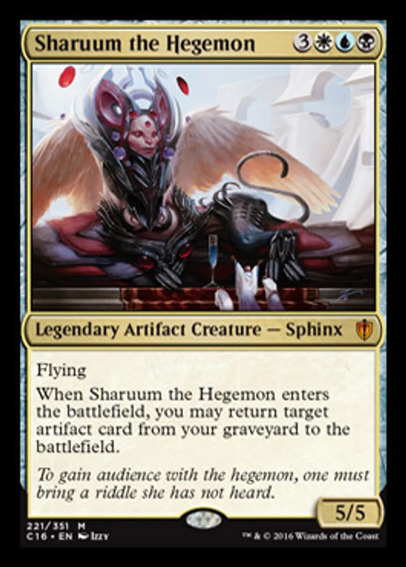 | Oracle Text | Flying When Sharuum the Hegemon enters the battlefield, you may return target artifact card from your graveyard to the battlefield. | ||