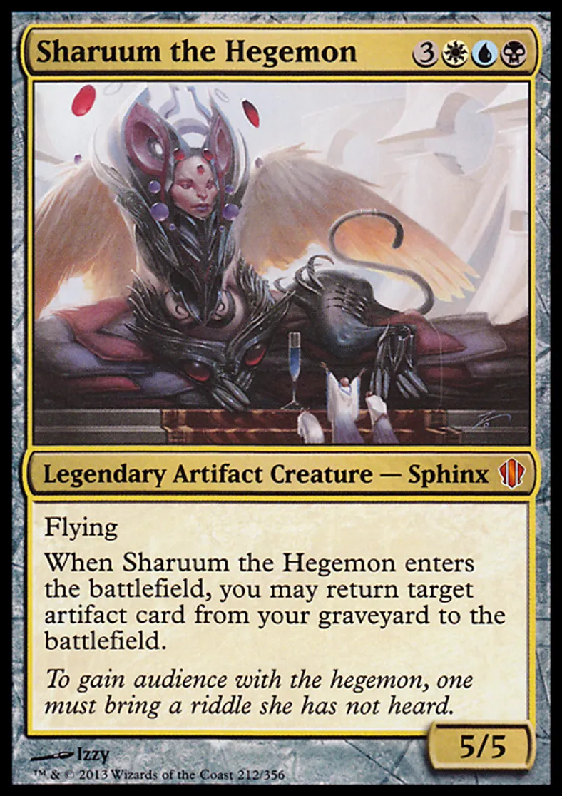 | Oracle Text | Flying When Sharuum the Hegemon enters the battlefield, you may return target artifact card from your graveyard to the battlefield. | ||