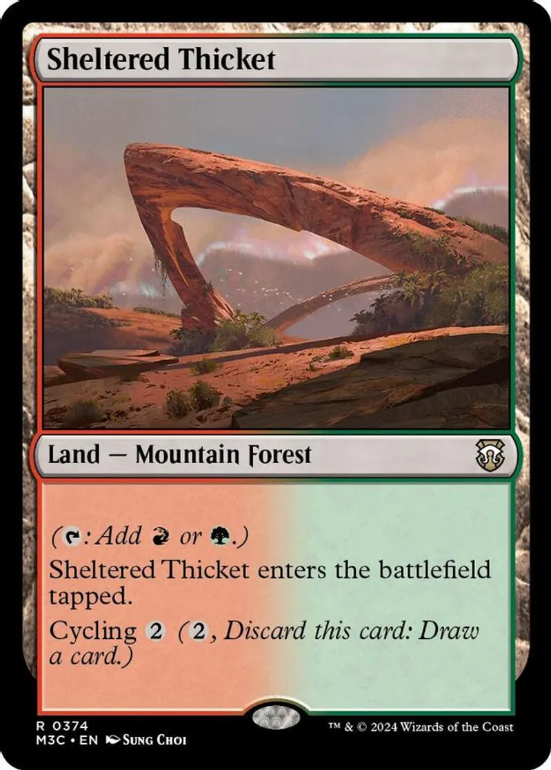 Magic: the Gathering (mtg) Rare land — mountain forest Sheltered Thicket from Modern Horizons 3 Commander (M3C) last updated 2025-12-13 15:21:31