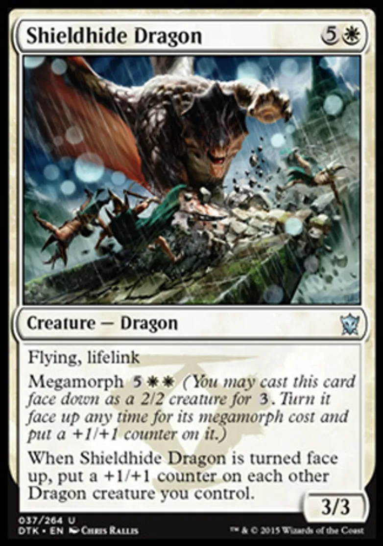 | Oracle Text | Flying, lifelink Megamorph {{5}}{{w}}{{w}} (You may cast this card face down as a 2/2 creature for {{3}}. Turn it face up any time for its megamorph cost and put a +1/+1 counter on it.) When Shieldhide Dragon is turned face up, put a +1/+1 counter on each other Dragon creature you control. | ||