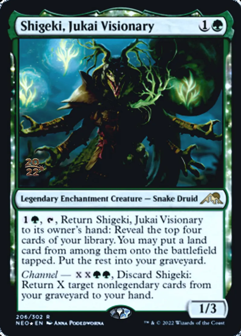 Magic: the Gathering (mtg) Rare Legendary Enchantment Creature — Snake Druid Shigeki, Jukai Visionary from Prerelease Cards (pPRE) last updated 2026-02-24 15:35:32
