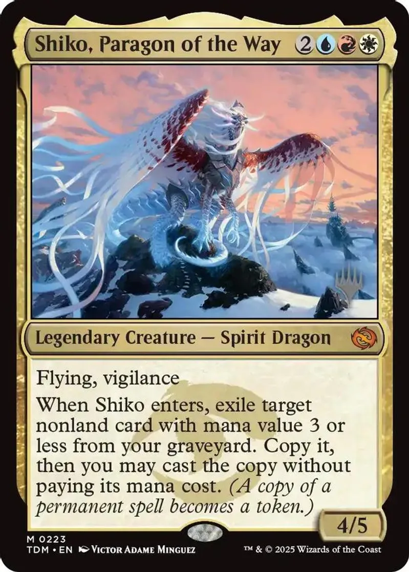 | Oracle Text | flying, vigilance when shiko enters, exile target nonland card with mana value 3 or less from your graveyard. copy it, then you may cast the copy without paying its mana cost. (a copy of a permanent spell becomes a token.) | ||