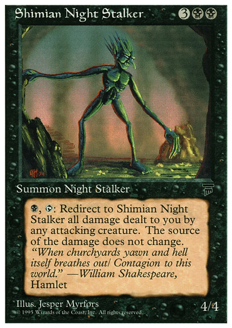| Oracle Text | {{b}}, {{t}}: All damage that would be dealt to you this turn by target attacking creature is dealt to Shimian Night Stalker instead. | ||