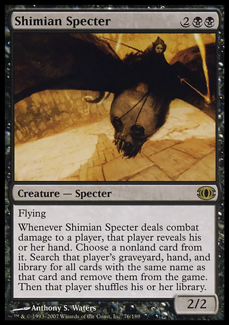 | Oracle Text | Flying Whenever Shimian Specter deals combat damage to a player, that player reveals his or her hand. You choose a nonland card from it. Search that player's graveyard, hand, and library for all cards with the same name as that card and exile them. Then that player shuffles his or her library. | ||