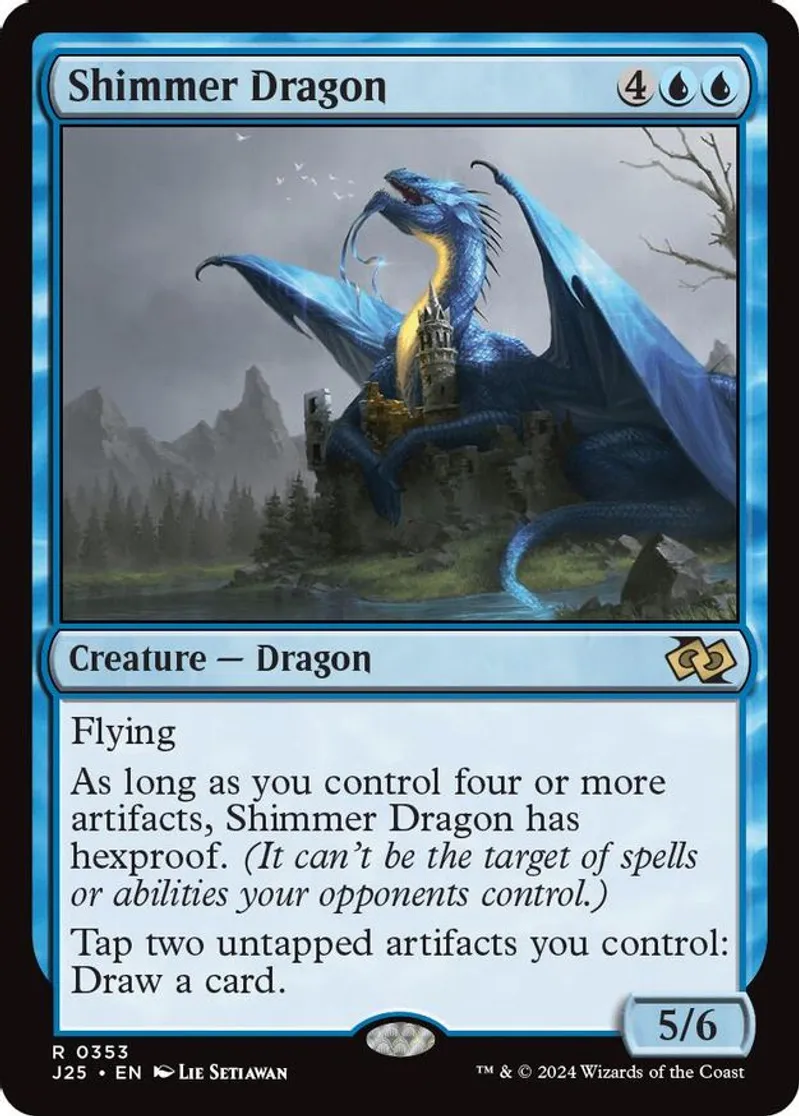 as long as you control four or more artifacts, shimmer dragon has hexproof. (it can't be the target of spells or abilities your opponents control.) tap two untapped artifacts you control: draw a card. | ||