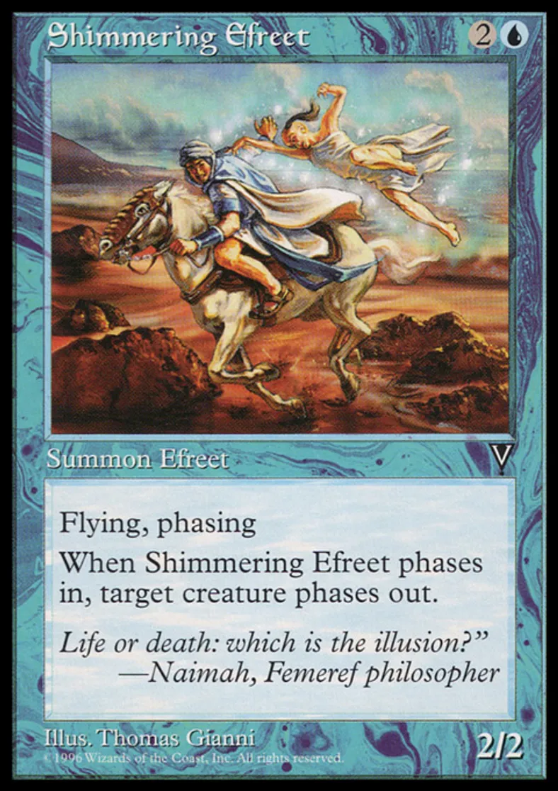 | Oracle Text | Flying Phasing (This phases in or out before you untap during each of your untap steps. While it's phased out, it's treated as though it doesn't exist.) Whenever Shimmering Efreet phases in, target creature phases out. (It phases in before its controller untaps during his or her next untap step.) | ||