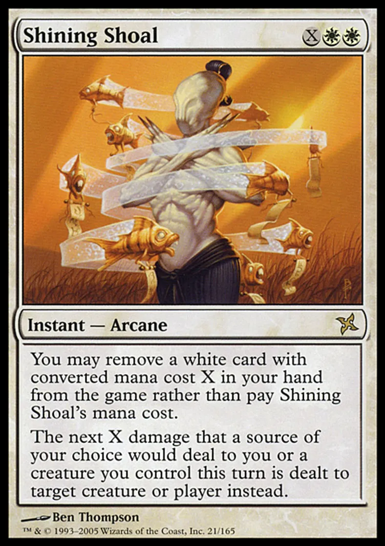 | Oracle Text | You may exile a white card with converted mana cost X from your hand rather than pay Shining Shoal's mana cost. The next X damage that a source of your choice would deal to you and/or creatures you control this turn is dealt to target creature or player instead. | ||