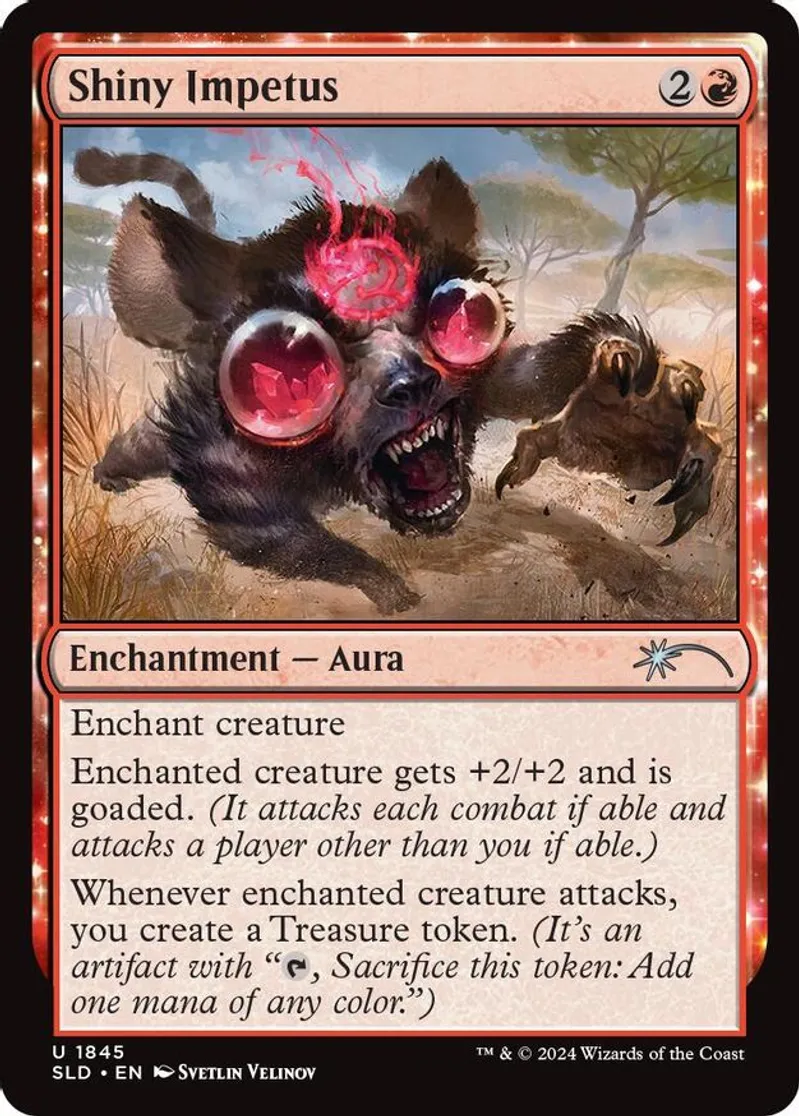 Magic: the Gathering (mtg) Uncommon enchantment — aura Shiny Impetus from Secret Lair Drop Series (SLD) last updated 2026-02-14 15:35:06