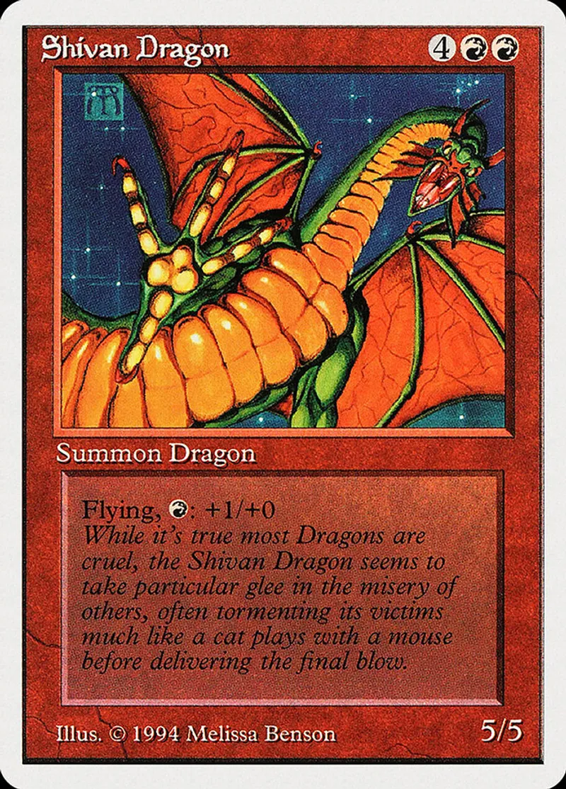 | Flavor Text | While it's true most Dragons are cruel, the Shivan Dragon seems to take particular glee in the misery of others, often tormenting its victims much like a cat plays with a mouse before delivering the final blow. | ||