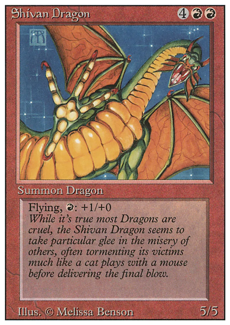 | Flavor Text | While it's true most Dragons are cruel, the Shivan Dragon seems to take particular glee in the misery of others, often tormenting its victims much like a cat plays with a mouse before delivering the final blow. | ||